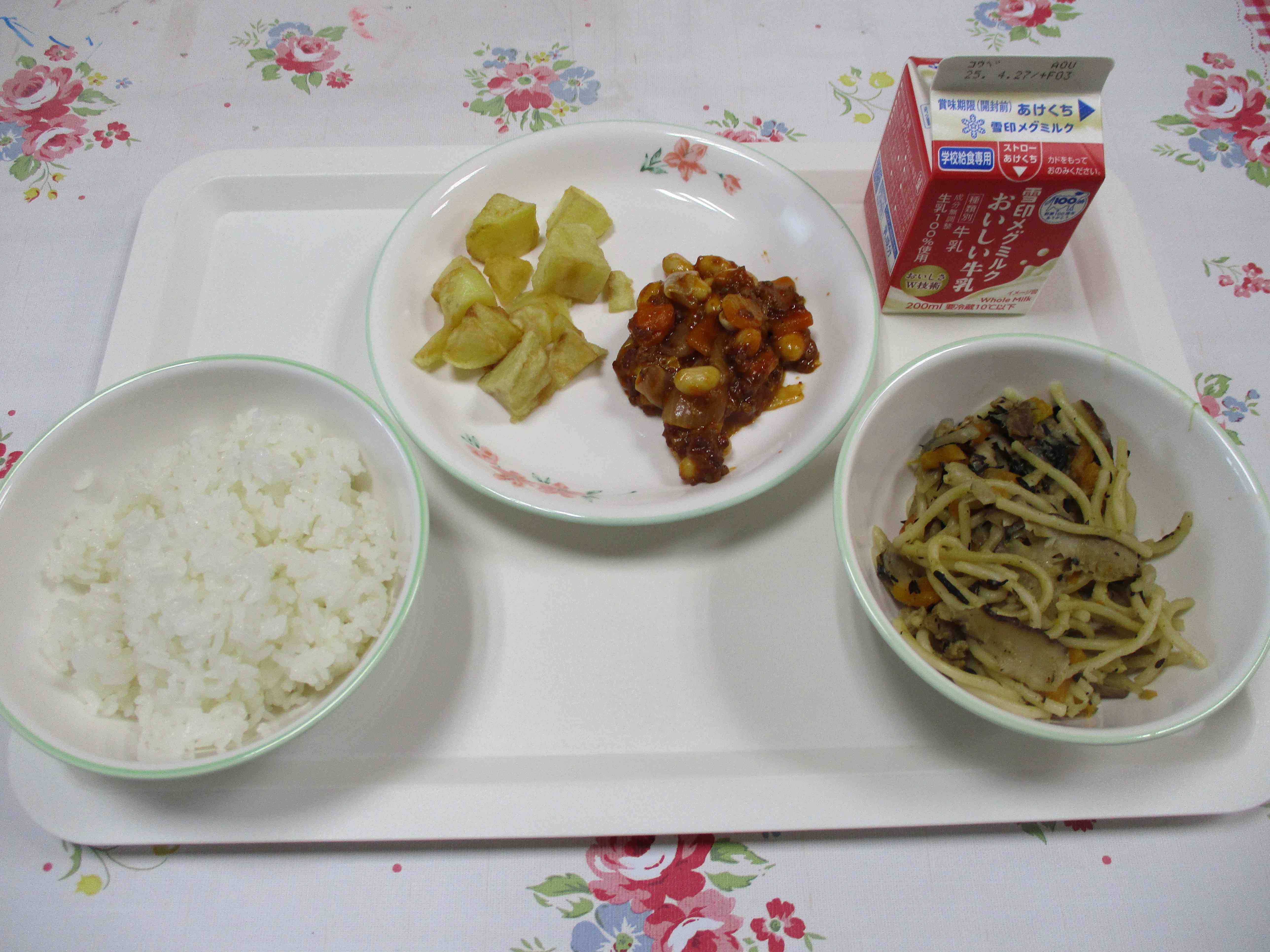 牛乳、ご飯(少なめ)、ひじきのスパゲティ、チリコンカン、コロコロポテト